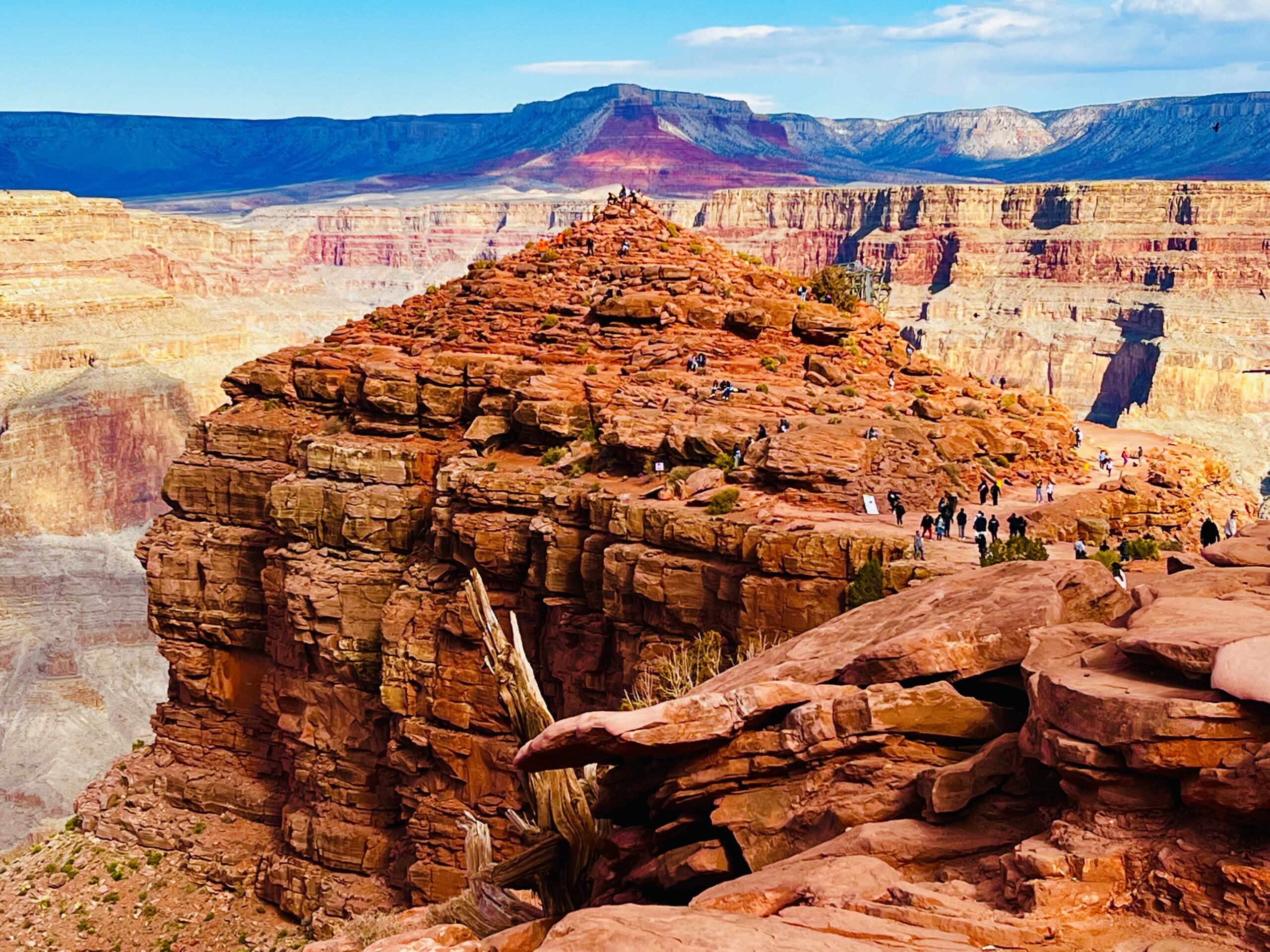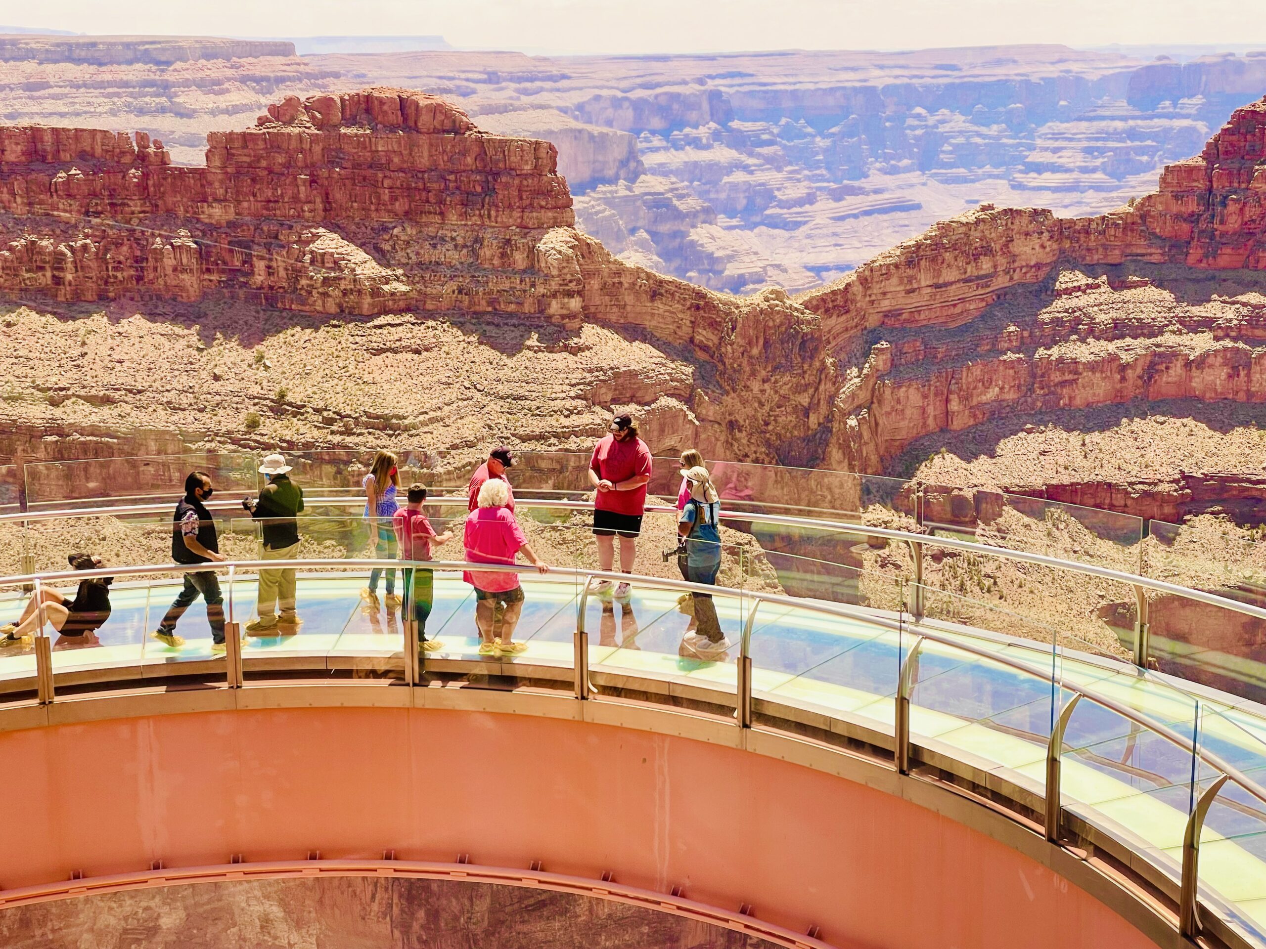 Al llegar al Gran Cañón West, dentro del territorio de la nación Hualapai, comienza lo mejor del tour: visitamos Eagle Point, donde se encuentra el famoso Skywalk (opcional), un impresionante puente de cristal suspendido sobre el abismo. Aquí disfrutarás de un almuerzo incluido con vista directa al cañón en el restaurante SkyView, mientras contemplas una de las vistas más sobrecogedoras del Gran Cañón.